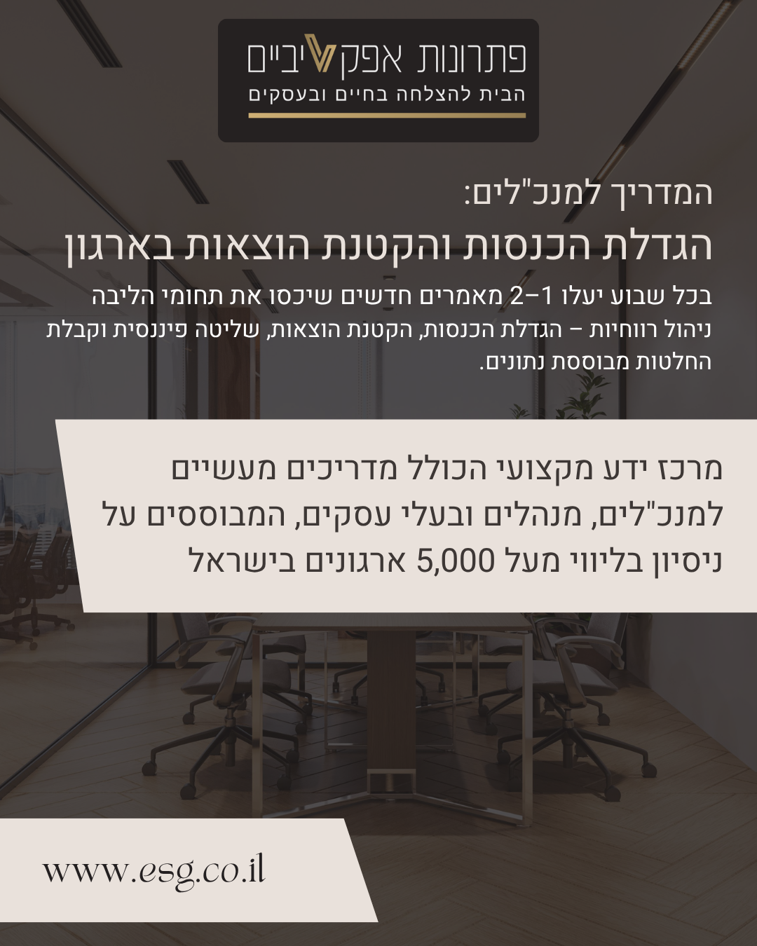 מרכז ידע מקצועי הכולל מדריכים מעשיים למנכ"לים, מנהלים ובעלי עסקים, המבוססים על ניסיון בליווי מעל 5,000 ארגונים בישראל.